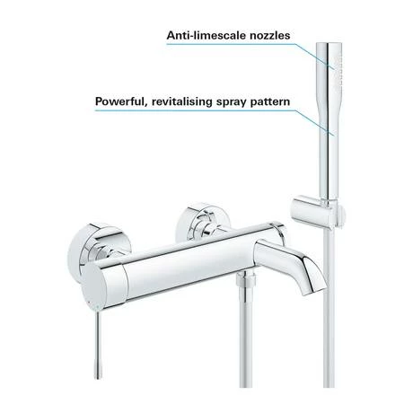 For the modern bathroom, the Essence bath shower mixer is the ideal choice with its attractive design and functional features. Thanks to the GROHE SilkMove technology, it can be operated with ease. It also features a SpeedClean shower head so limescale residue is simply and easily wiped away and a non-return valve to stop backflow of wastewater into your water supply. Crafted from high quality materials and finished in a special chrome coating that is scratch resistant and easy to clean.